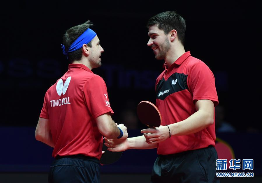 12月12日,波尔(左)/弗朗西斯科庆祝比赛胜利。 当日,在郑州进行的2019国际乒联世界巡回赛总决赛男双四分之一决赛中,德国选手波尔/弗朗西斯科以3比2战胜同胞杜达/邱党,晋级四强。 新华社记者李嘉南摄