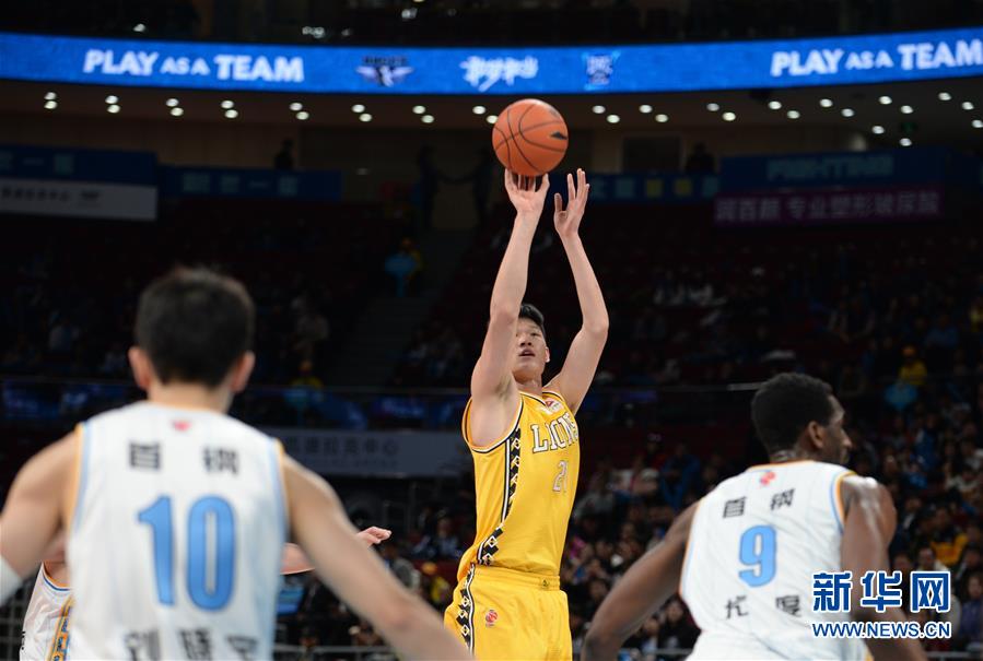 12月17日,浙江广厦控股队球员胡金秋(中)在比赛中投篮。 当日,在2019-2020赛季中国男子篮球职业联赛(CBA)常规赛第18轮比赛中,北京首钢队主场以105比95战胜浙江广厦控股队。 新华社发(侯昭康摄)
