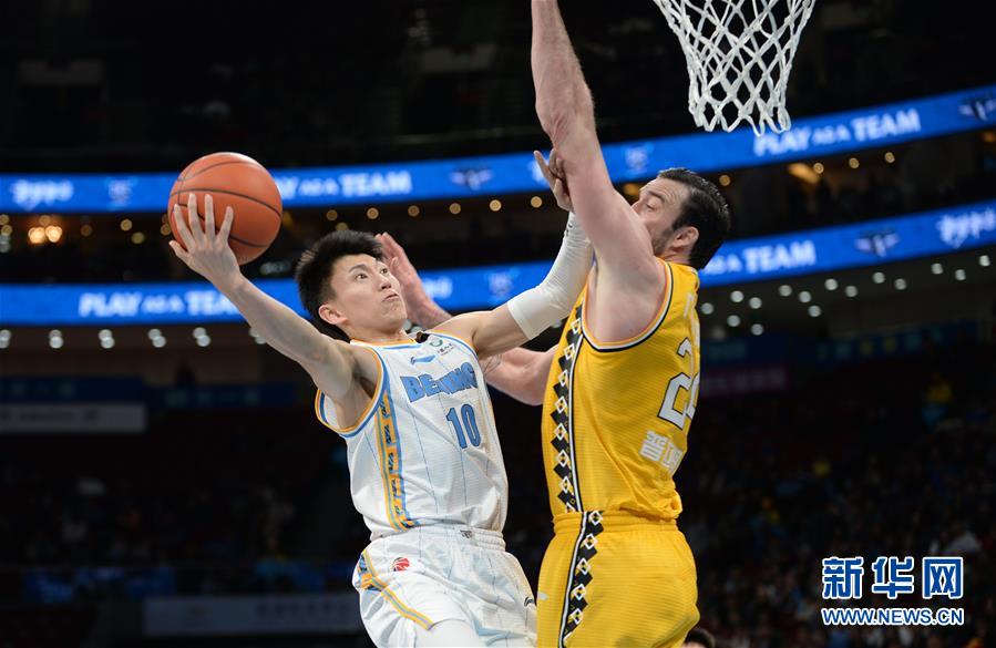 12月17日,北京首钢队球员刘晓宇(左)突破浙江广厦控股队球员普拉姆利的防守上篮。 当日,在2019-2020赛季中国男子篮球职业联赛(CBA)常规赛第18轮比赛中,北京首钢队主场以105比95战胜浙江广厦控股队。 新华社发(侯昭康摄)