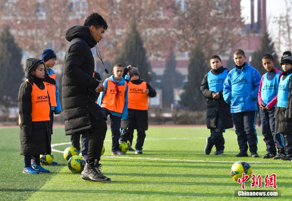 12月18日,来自广州市启慧学校的援疆老师徐均猛在新疆疏附县明德小学足球场上带领学生们训练。自2017年,广东省在对口援建的新疆疏附县开始实施“足球援疆”计划,抽调广东省足球教练及老师,前往疏附县各中小学援疆支教,并援建4个足球场地,提供大批足球训练器械及服装等,举办多场足球比赛,助当地酷爱足球的青少年实现足球梦。 中新社记者 刘新 摄