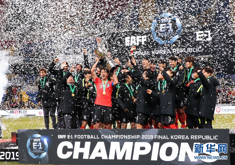 12月18日,韩国队在颁奖仪式上庆祝夺冠。 当日,在韩国釜山举行的2019东亚杯男足比赛中,韩国队以三战全胜的成绩夺得冠军。 新华社记者王婧嫱摄