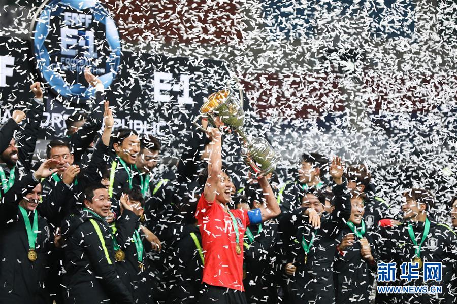 12月18日,韩国队在颁奖仪式上庆祝夺冠。 当日,在韩国釜山举行的2019东亚杯男足比赛中,韩国队以三战全胜的成绩夺得冠军。 新华社记者张可任摄