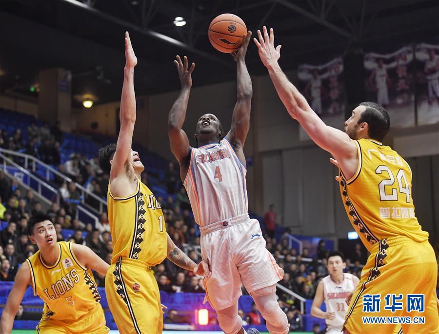12月19日,四川五粮金樽队球员福特森(左三)在比赛中上篮。 当日,在2019-2020赛季中国男子篮球职业联赛(CBA)常规赛第19轮比赛中,四川五粮金樽队主场以116比112战胜浙江广厦控股队。 新华社记者刘坤摄
