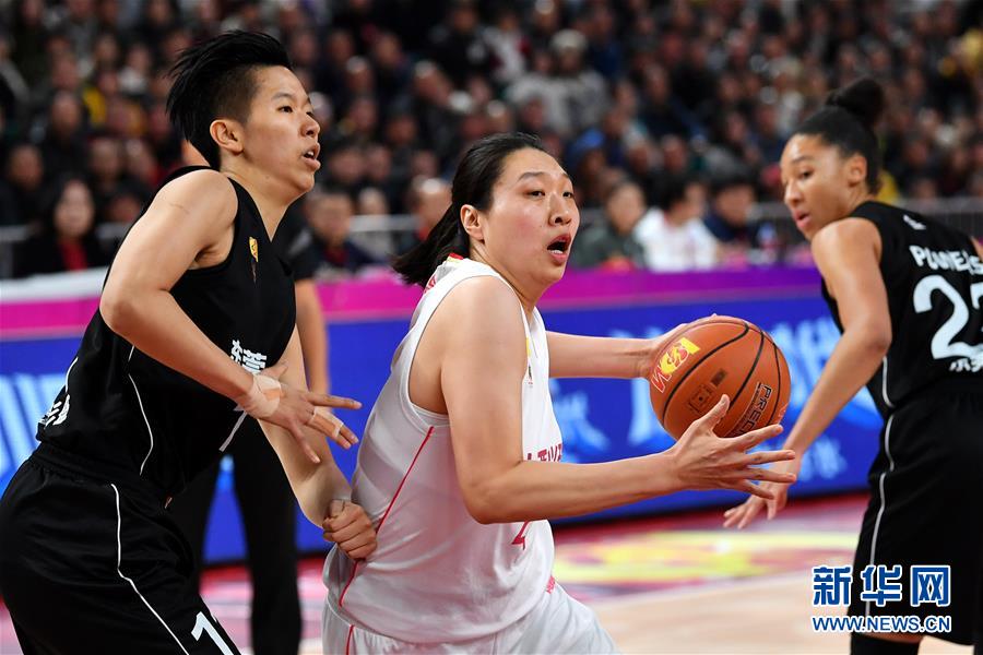 12月19日,山西竹叶青队球员刘佳岑(中)在比赛中带球突破。 当日,在2019-2020赛季中国女子篮球联赛(WCBA)常规赛第12轮比赛中,东莞新彤盛队客场以85比74战胜山西竹叶青队。 新华社记者詹彦摄