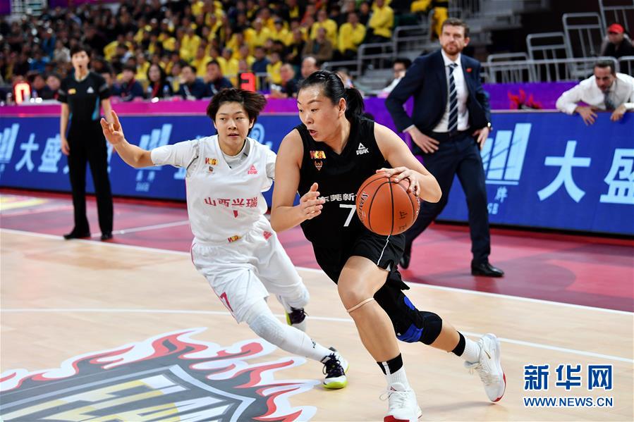 12月19日,东莞新彤盛球员张冬霞(右)在比赛中带球突破。 当日,在2019-2020赛季中国女子篮球联赛(WCBA)常规赛第12轮比赛中,东莞新彤盛队客场以85比74战胜山西竹叶青队。 新华社记者詹彦摄