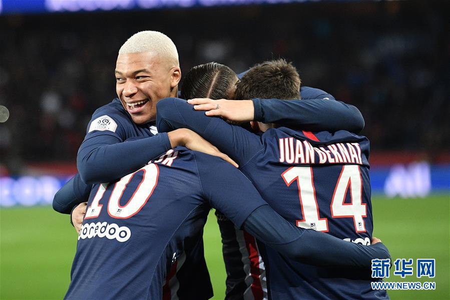 12月21日,巴黎圣日耳曼队球员姆巴佩(左)进球后与队友庆祝。 当日,在2019-2020赛季法国足球甲级联赛第19轮比赛中,巴黎圣日耳曼队主场以4比1战胜亚眠队。 新华社发(杰克·陈摄)