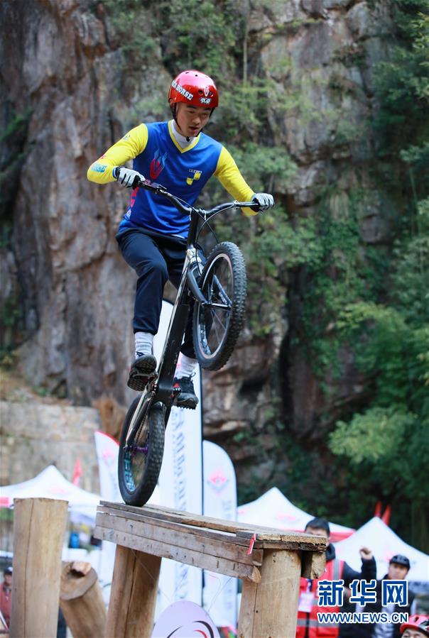 12月22日,重庆自行车手赵旋在攀爬竞技比赛中,最终他获得了第一名。 当日,2019中国户外健身休闲大会宝峰湖自行车攀爬精英表演赛在湖南张家界宝峰湖景区举行,来自广西、湖北、重庆等地的9名极限自行车手在秀美的山水间进行高难度的攀爬竞技表演比赛。 新华社发(吴勇兵摄)