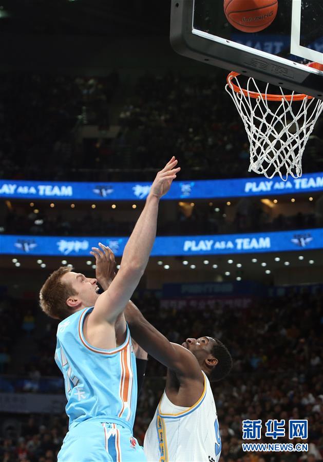 12月25日,新疆伊力特队球员米卡(左)在比赛中投篮。 当日,在2019-2020赛季中国男子篮球职业联赛(CBA)常规赛第21轮比赛中,北京首钢队主场以87比88不敌新疆伊力特队。 新华社记者 李莹 摄