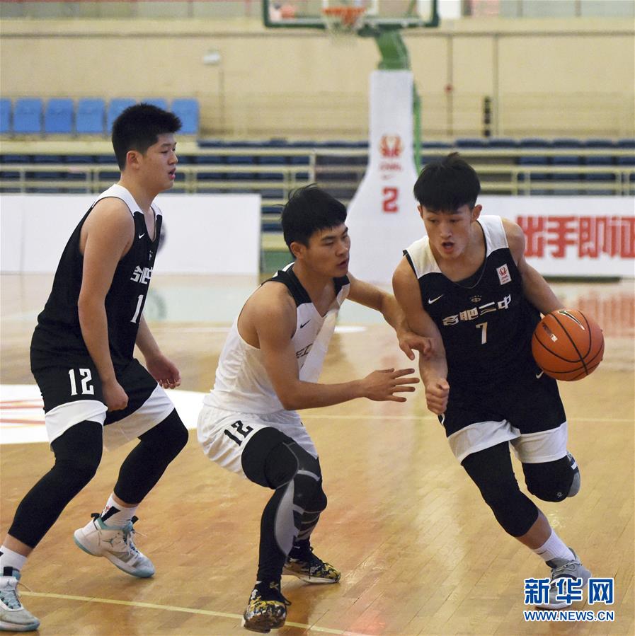 12月25日,合肥市第三中学球员汪涵(右)在比赛中进攻。 当日,在2019-2020耐克中国高中联赛基层赛安徽赛区B组比赛中,合肥市第三中学队以52比50战胜安徽工业大学附属中学队。 新华社发(周牧摄)