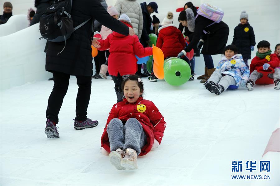 12月27日,小学生在活动上体验冰雪滑梯。 当日,北京东城区分司厅小学一、二年级近1500名学生及家长在国家体育场举行冰雪嘉年华活动,感受冰雪世界带来的快乐。 新华社发(周良 摄)