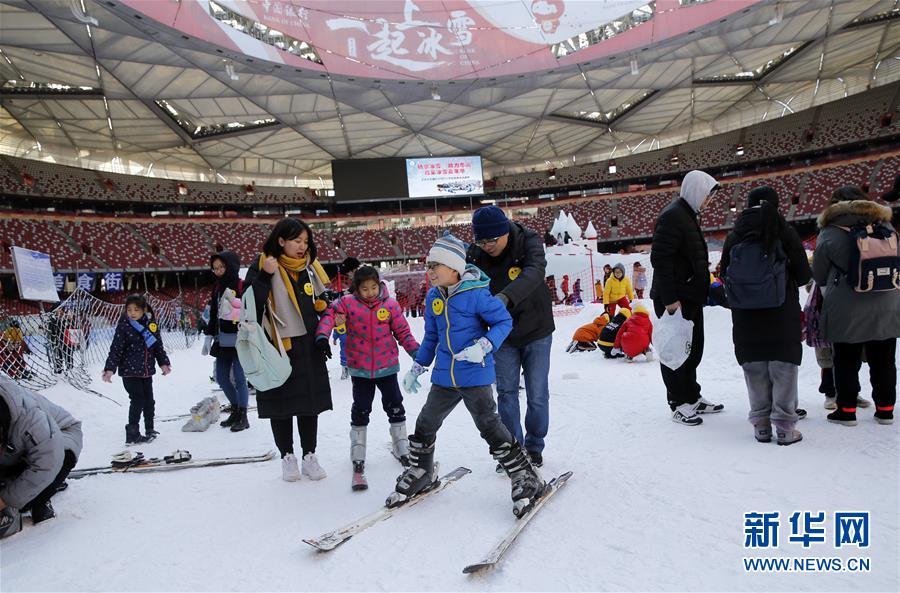 12月27日,小学生在活动上体验滑雪。 当日,北京东城区分司厅小学一、二年级近1500名学生及家长在国家体育场举行冰雪嘉年华活动,感受冰雪世界带来的快乐。 新华社发(周良 摄)