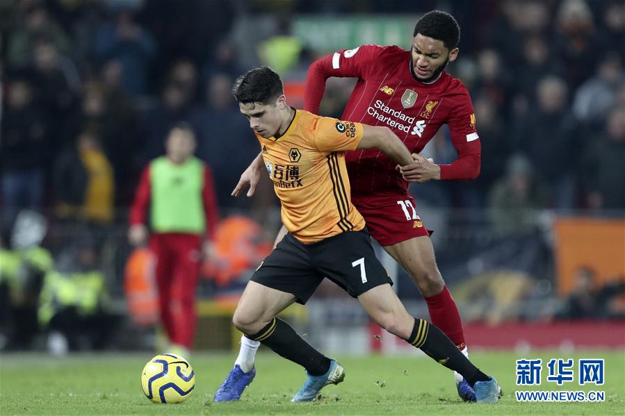 12月29日,利物浦队球员戈麦斯(右)与狼队球员内托拼抢。 当日,在2019-2020赛季英格兰足球超级联赛第20轮比赛中,利物浦队主场以1比0战胜狼队。 新华社/美联