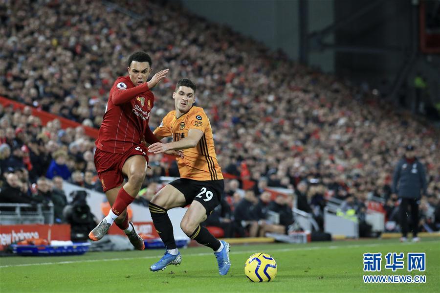 12月29日,利物浦队球员阿诺德(左)与狼队球员维纳格雷拼抢。 当日,在2019-2020赛季英格兰足球超级联赛第20轮比赛中,利物浦队主场以1比0战胜狼队。 新华社/美联