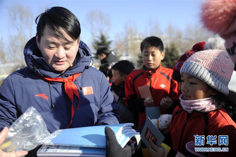 12月31日,在吉林省汪清县童长荣红军小学,短道速滑世界冠军梁文豪(左一)给博爱冠军速滑校队的学生们送上冰雪运动教材。新华社记者 刘勇贞 摄