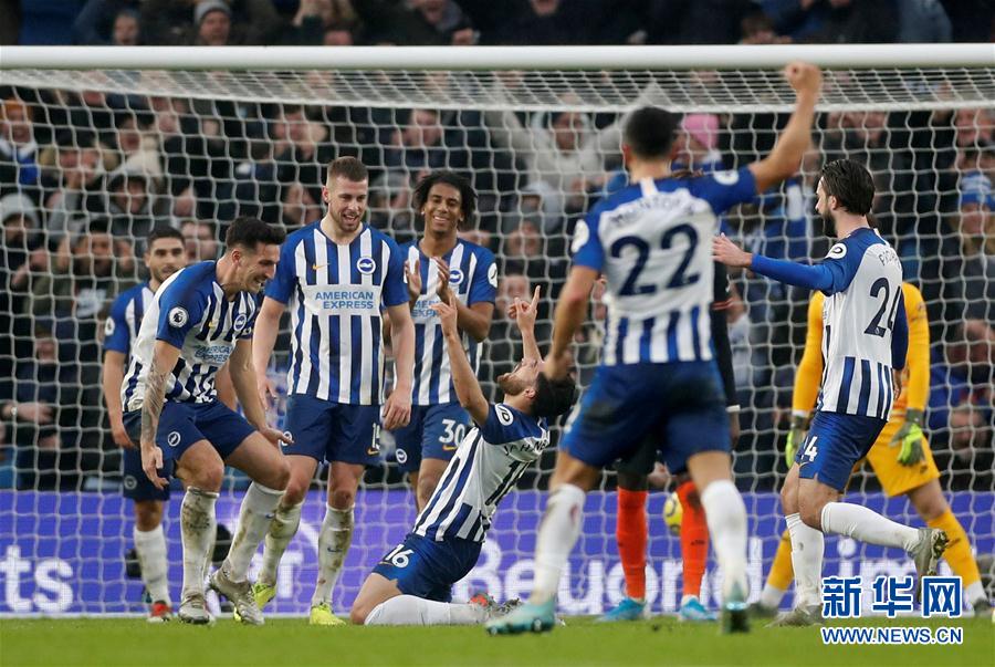 1月1日,布莱顿队球员贾汉巴赫什(左五)在进球后庆祝。 当日,在2019-2020赛季英超联赛第21轮比赛中,切尔西队客场以1比1战平布莱顿队。 新华社/路透