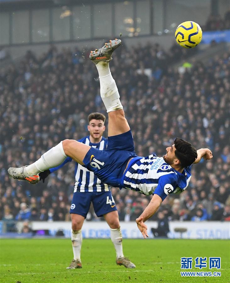 1月1日,布莱顿队球员贾汉巴赫什(前)在比赛中倒钩得分。 当日,在2019-2020赛季英超联赛第21轮比赛中,切尔西队客场以1比1战平布莱顿队。 新华社/路透