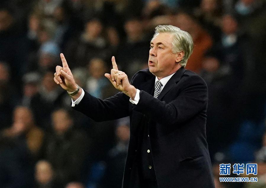 1月1日,埃弗顿队主帅安切洛蒂在比赛中指挥球员。 当日,在2019-2020赛季英格兰足球超级联赛第21轮比赛中,曼彻斯特城队主场以2比1战胜埃弗顿队。 新华社/路透