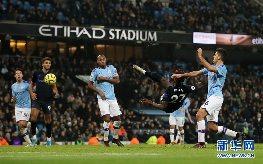 1月1日,埃弗顿队球员基恩(前右二)凌空射门。 当日,在2019-2020赛季英格兰足球超级联赛第21轮比赛中,曼彻斯特城队主场以2比1战胜埃弗顿队。 新华社/路透