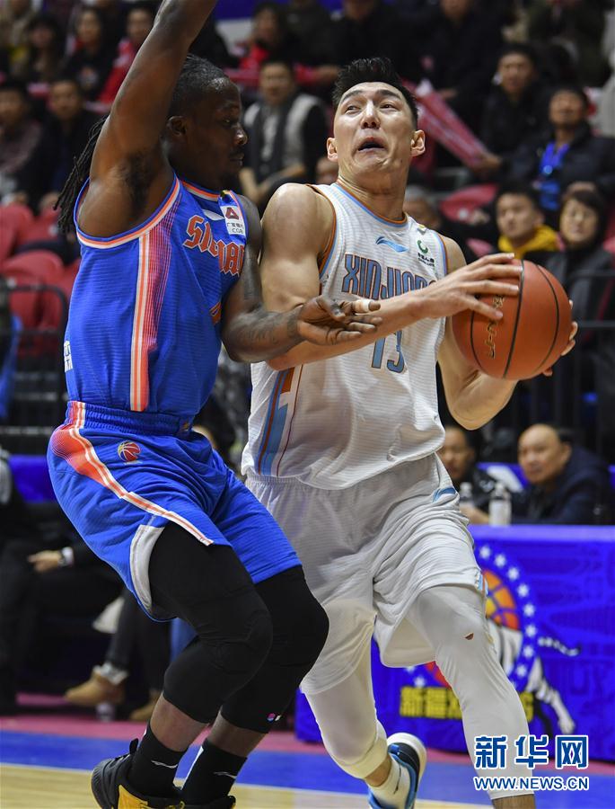 1月2日,新疆伊力特队球员可兰白克(右)在四川五粮金樽队球员福特森的防守下进攻。 当日,在2019-2020赛季中国男子篮球职业联赛(CBA)常规赛第24轮比赛中,新疆伊力特队主场以120比111战胜四川五粮金樽队。 新华社记者胡虎虎摄