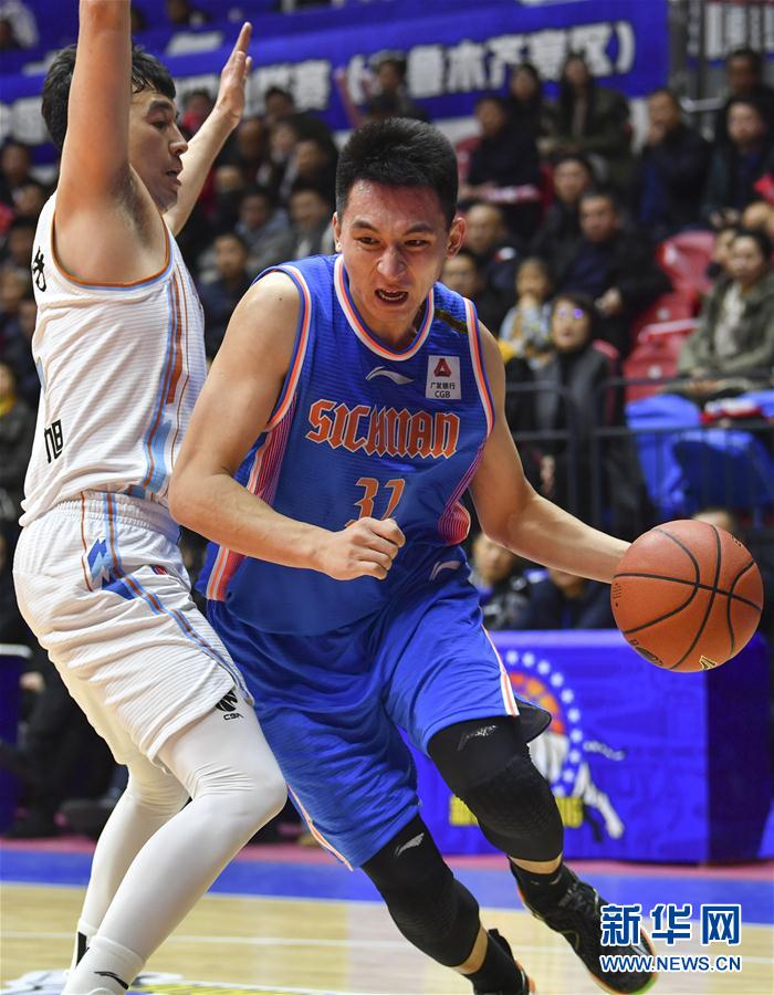 1月2日,四川五粮金樽队球员陈辰(右)持球突破新疆伊力特队球员曾令旭的防守。 当日,在2019-2020赛季中国男子篮球职业联赛(CBA)常规赛第24轮比赛中,新疆伊力特队主场以120比111战胜四川五粮金樽队。 新华社记者胡虎虎摄