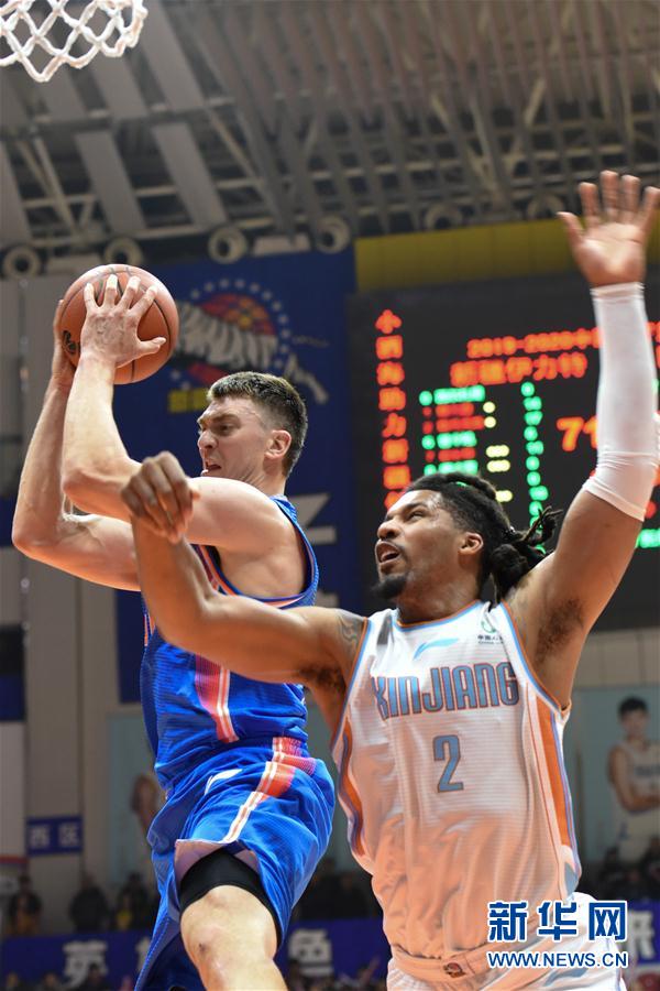 1月2日,四川五粮金樽队球员汉斯布鲁(左)和新疆伊力特队球员斯托克斯拼抢篮板球。 当日,在2019-2020赛季中国男子篮球职业联赛(CBA)常规赛第24轮比赛中,新疆伊力特队主场以120比111战胜四川五粮金樽队。 新华社记者丁磊摄