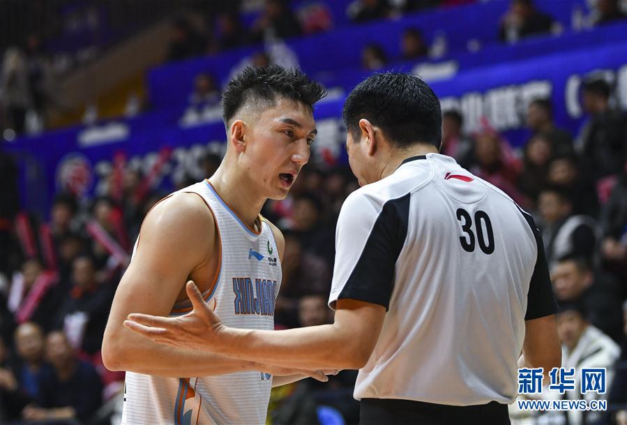 1月2日,新疆伊力特队球员可兰白克(左)在比赛中与裁判沟通。 当日,在2019-2020赛季中国男子篮球职业联赛(CBA)常规赛第24轮比赛中,新疆伊力特队主场以120比111战胜四川五粮金樽队。 新华社记者胡虎虎摄