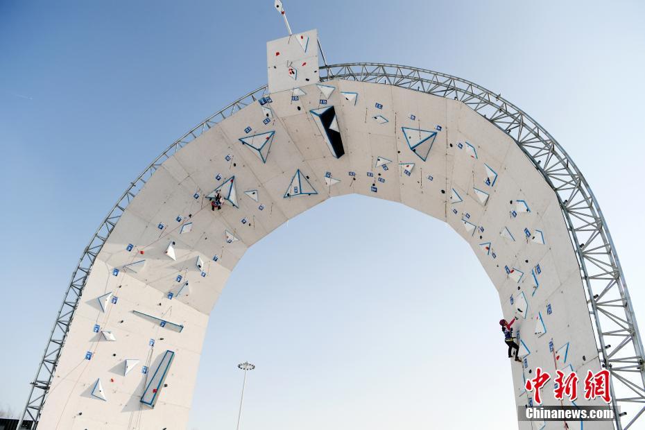 1月3日,2019-2020赛季国际登联攀冰世界杯在长春莲花山生态旅游度假区主题驿站举行。本次比赛分设男女速度赛和难度赛四个项目,共有16个国家和地区的近80名运动员参赛。图为运动员在比赛中。中新社记者 张瑶 摄