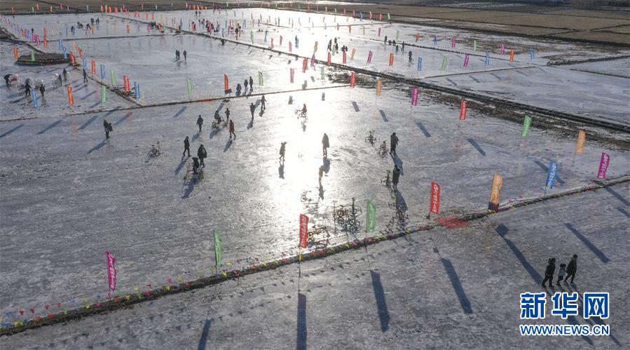 1月4日,在河北唐山遵化市西留村乡后铺村,人们在稻田冬灌后形成的露天滑冰场玩耍(无人机照片)。 冬季里,人们走到户外,或感受冰雪运动的乐趣,或体验冬泳的酣畅,以多种方式度过美好的时光。 新华社发(刘满仓 摄)