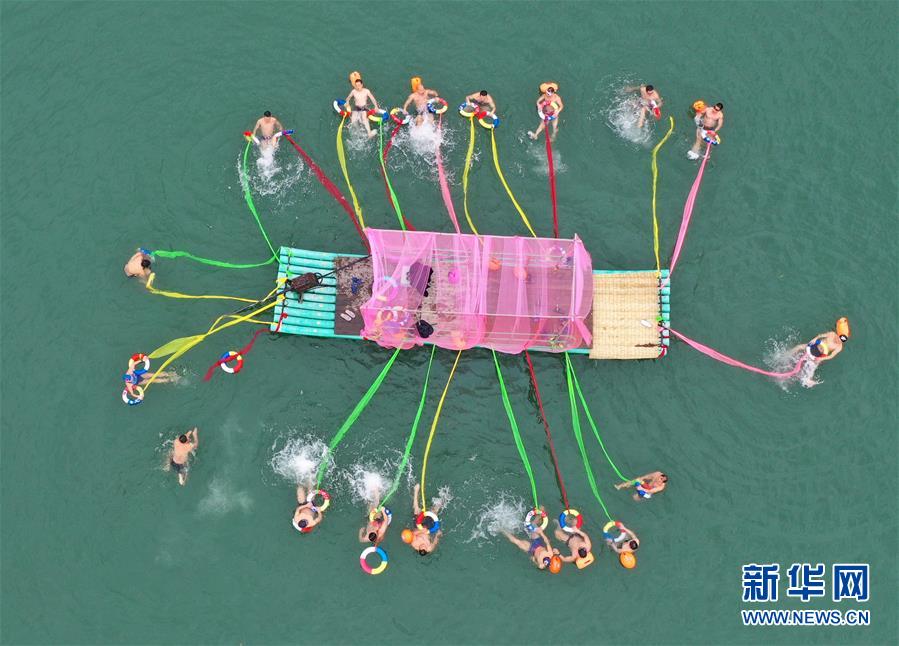 1月4日,湖南省衡阳市衡南县的冬泳爱好者在湘江中畅游(无人机照片)。 冬季里,人们走到户外,或感受冰雪运动的乐趣,或体验冬泳的酣畅,以多种方式度过美好的时光。 新华社发(曹正平 摄)