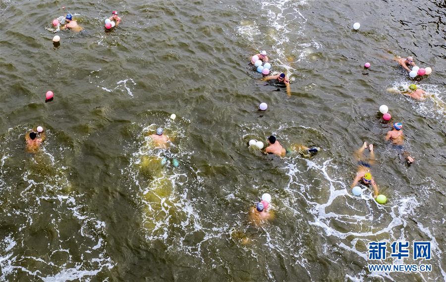 1月4日,冬泳爱好者在山西运城七彩盐湖景区进行冬泳抢气球趣味活动(无人机照片)。 冬季里,人们走到户外,或感受冰雪运动的乐趣,或体验冬泳的酣畅,以多种方式度过美好的时光。 新华社发(薛俊 摄)