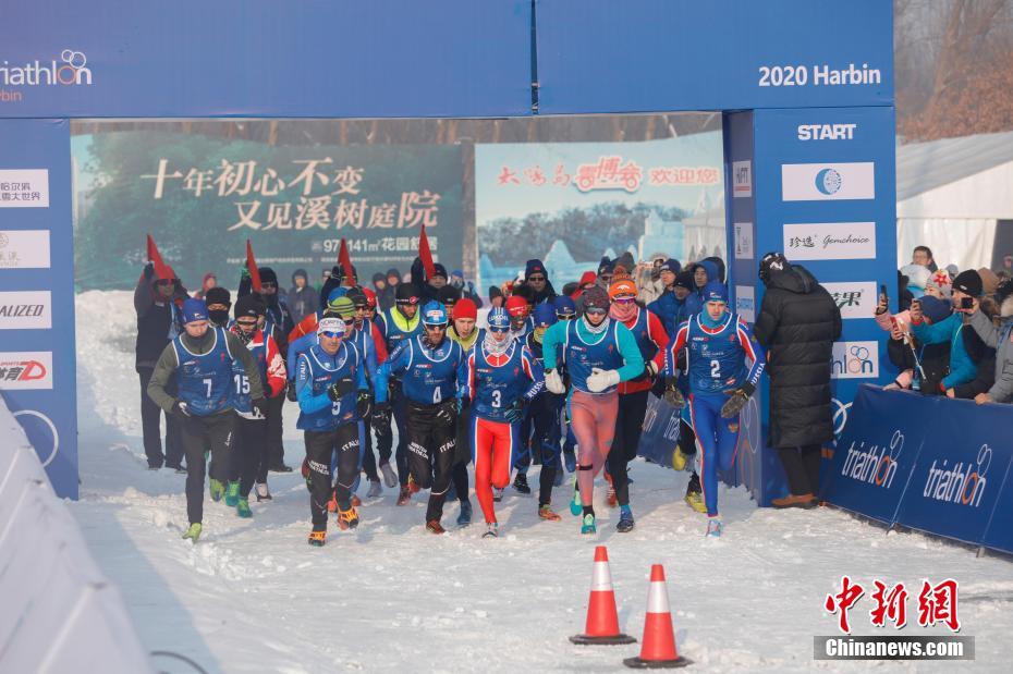 1月4日,2020年冬季铁人三项世界杯赛在哈尔滨举行,来自20个国家和地区的近300名运动员参加了比赛。图为男子组比赛现场。中新社记者 吕品 摄