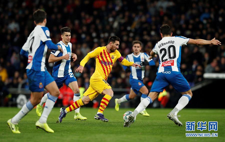 1月4日,巴塞罗那队球员梅西(中)在比赛中带球进攻。 当日,在2019-2020赛季西班牙足球甲级联赛第19轮比赛中,西班牙人队主场以2比2战平巴塞罗那队。 新华社/路透