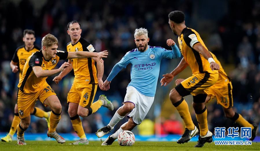 1月4日,曼城队球员阿圭罗(右二)在比赛中带球进攻。 当日,在2019-2020赛季英格兰足总杯第三轮比赛中,曼城队主场以4比1战胜韦尔港队。 新华社/路透