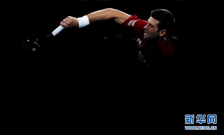 1月6日,焦科维奇在比赛中回球。 当日,在澳大利亚布里斯班进行的ATP杯网球赛A组比赛中,塞尔维亚队选手焦科维奇以2比0战胜法国队选手孟菲斯。 新华社记者白雪飞摄