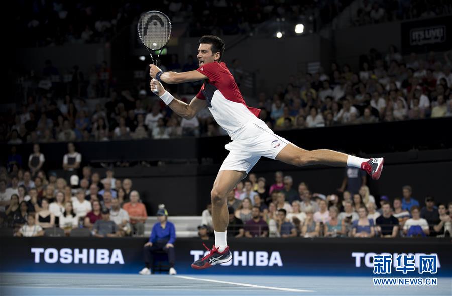 1月6日,焦科维奇在比赛中回球。 当日,在澳大利亚布里斯班进行的ATP杯网球赛A组比赛中,塞尔维亚队选手焦科维奇以2比0战胜法国队选手孟菲斯。 新华社记者白雪飞摄