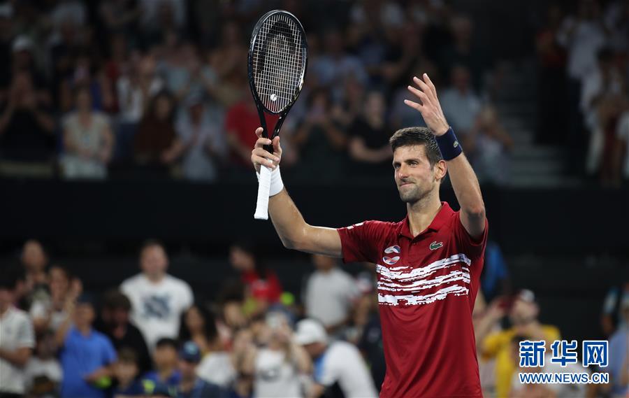 1月6日,焦科维奇在获胜后庆祝。 当日,在澳大利亚布里斯班进行的ATP杯网球赛A组比赛中,塞尔维亚队选手焦科维奇以2比0战胜法国队选手孟菲斯。 新华社记者白雪飞摄