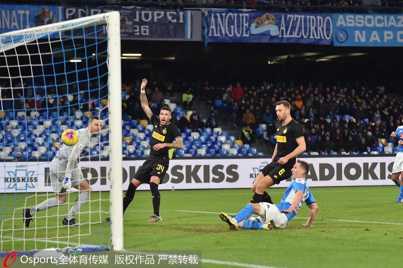第38分钟,那不勒斯队因西涅与米力克在大禁区做撞墙配合后搓射远角,国际米兰门将汉达诺维奇飞身扑救将皮球牢牢控制。