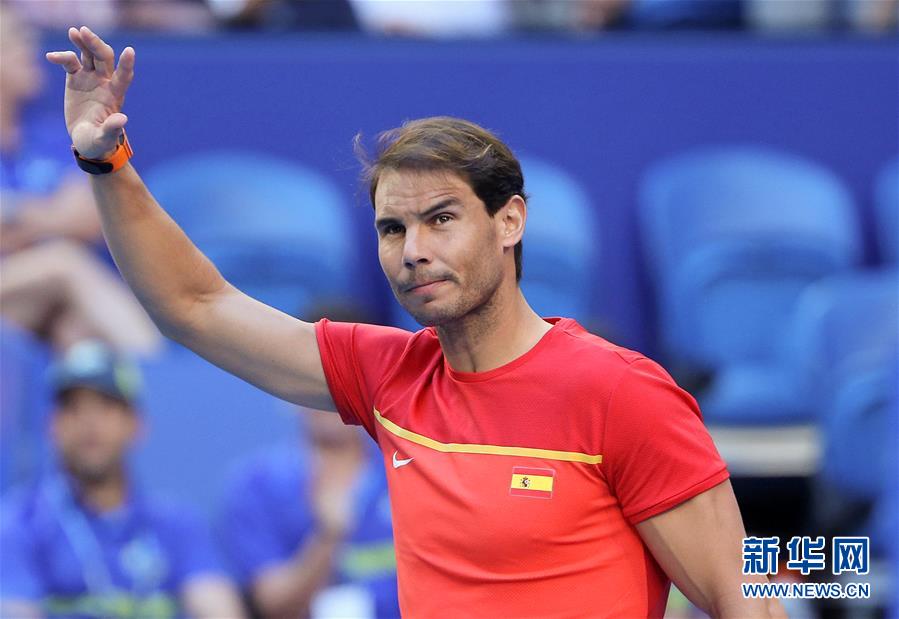 1月6日,纳达尔在比赛前向观众致意。 当日,在澳大利亚珀斯进行的ATP杯网球赛B组比赛中,西班牙队选手纳达尔以2比0战胜乌拉圭队选手奎瓦斯。 新华社发(周丹摄)