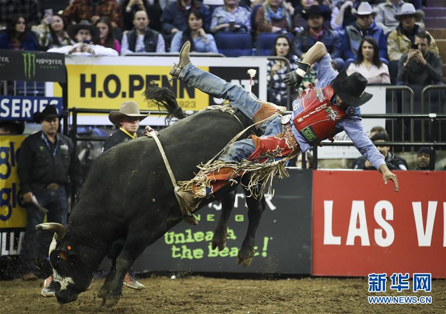 1月5日,牛仔索萨在比赛中试骑。 当日,2020职业牛仔竞技赛“挑战公牛”纽约站比赛落幕。 新华社记者王迎摄