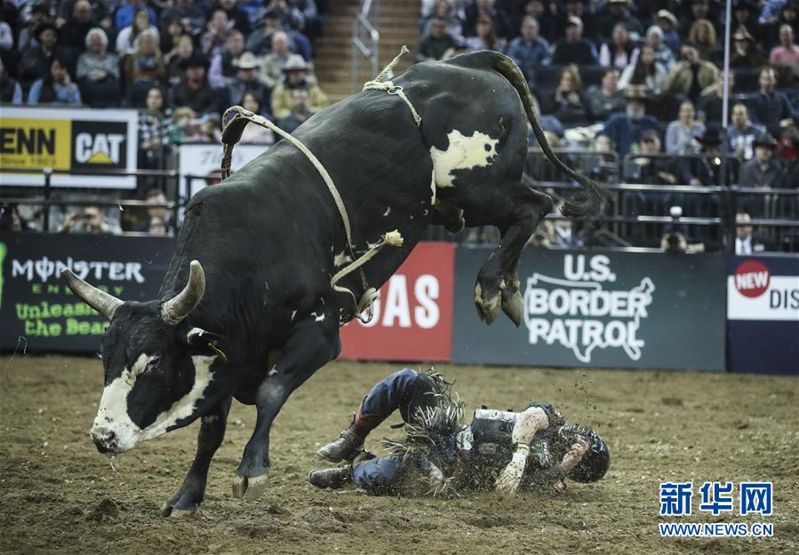 1月5日,牛仔巴尔博萨在比赛中试骑失败。 当日,2020职业牛仔竞技赛“挑战公牛”纽约站比赛落幕。 新华社记者王迎摄