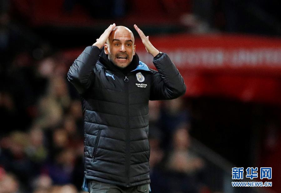 1月7日,曼城队主教练瓜迪奥拉在场边指挥。 当日,在2019-2020赛季英格兰足总杯半决赛首回合比赛中,曼彻斯特城队客场以3比1战胜曼彻斯特联队。 新华社/路透