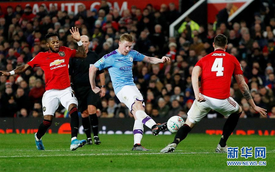 1月7日,曼城队球员德布劳内(右二)在比赛中射门。 当日,在2019-2020赛季英格兰足总杯半决赛首回合比赛中,曼彻斯特城队客场以3比1战胜曼彻斯特联队。 新华社/路透