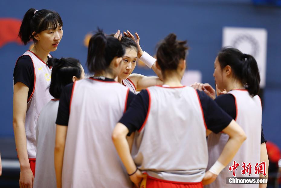1月8日,由中国篮球协会主办的2020中国女篮新春媒体公开课在北京国家体育总局训练局举行。图为中国女篮队员韩旭(左一)、孙梦然(右三)准备与队友进行训练。中新社记者 盛佳鹏 摄