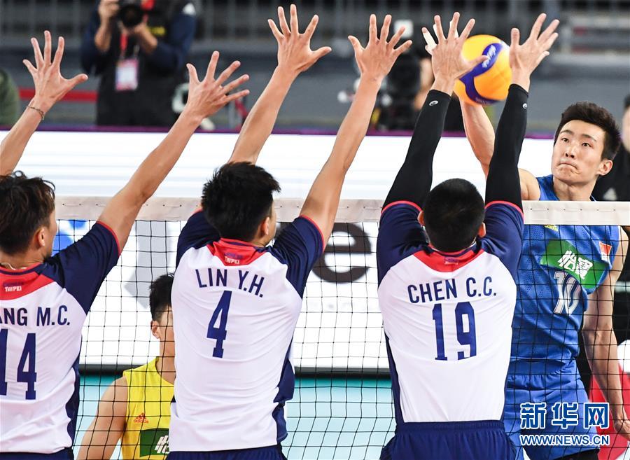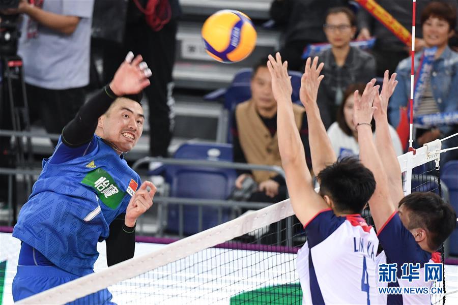 1月8日,中国男排球员季道帅(右一)在比赛中扣球。 当日,在广东江门举行的亚洲排联2020东京奥运会男排资格赛小组赛中,中国队以3比2战胜中国台北队。 新华社记者邓华摄