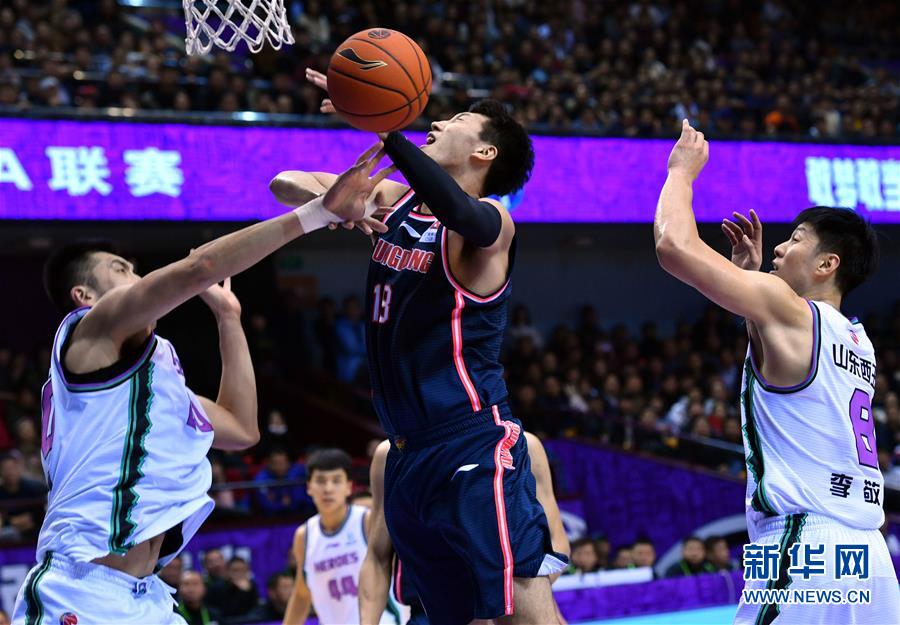 1月7日,广东东莞银行队球员杜润旺(中)在比赛中进攻受阻。 当日,在2019-2020赛季中国男子篮球职业联赛(CBA)常规赛第26轮比赛中,广东东莞银行队客场以107比102战胜山东西王队。 新华社记者朱峥摄