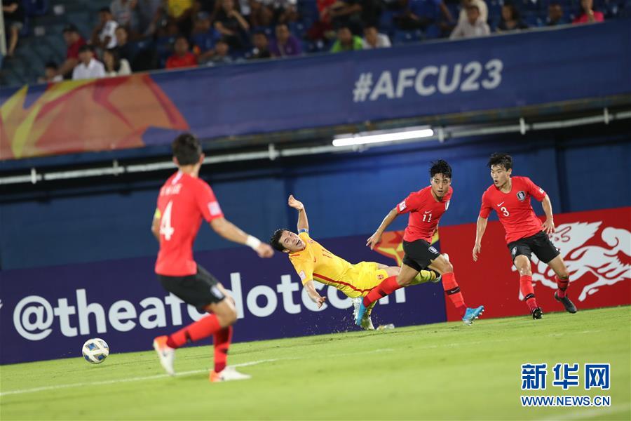 1月9日,中国国奥队球员陈彬彬(左二)在比赛中倒地。 当日,在泰国宋卡举行的亚足联U23锦标赛决赛阶段比赛暨2020东京奥运会男足预选赛C组比赛中,中国国奥队以0比1负于韩国国奥队。 新华社记者 张可任 摄