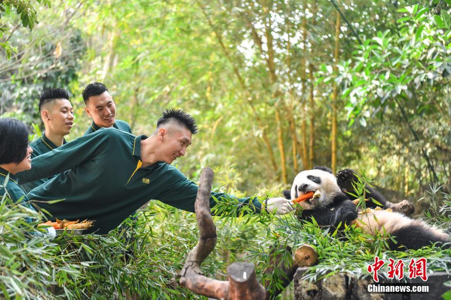 1月11日,CBA球员孙悦在广州长隆野生动物世界用胡萝卜喂熊猫。当日,“CBA你我TA”公益活动、熊猫“国庆”百日庆典在广州长隆野生动物世界举行。 中新社记者 陈骥旻 摄