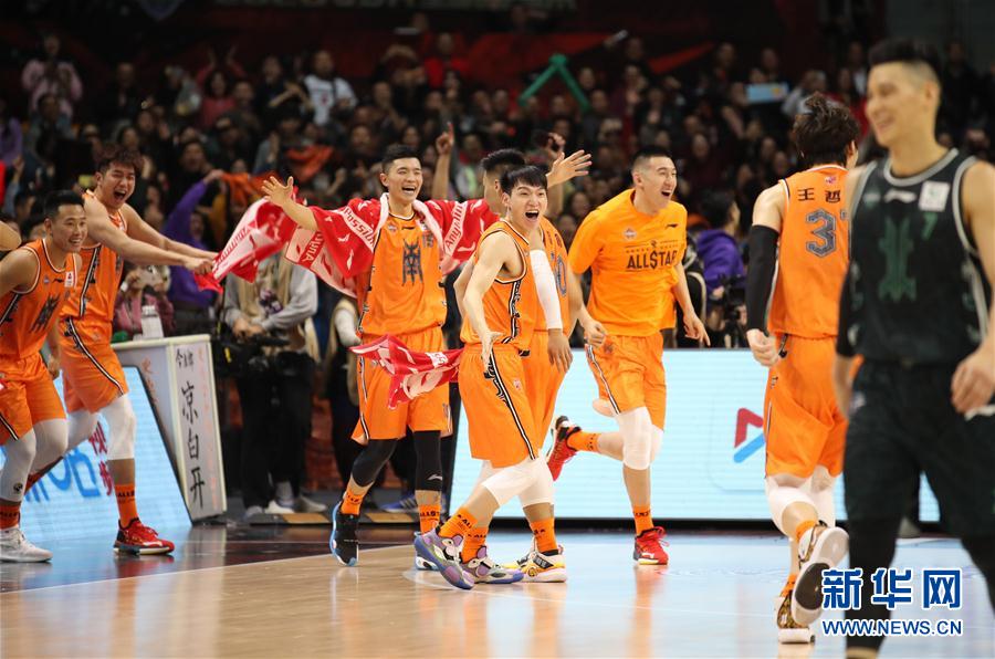 1月12日,南方明星队球员庆祝胜利。 当日,在广州举行的2020年CBA全明星赛中,南方明星队以167比166战胜北方明星队。 新华社记者孟永民摄