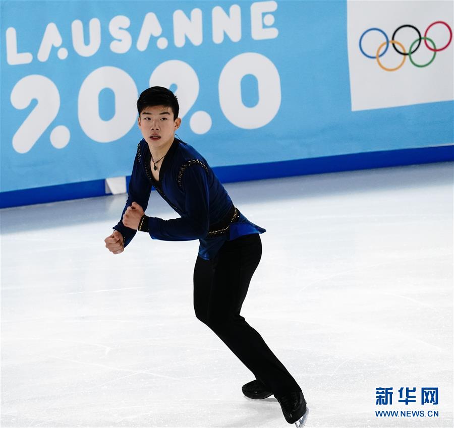 1月12日,陈昱东在男子单人滑自由滑比赛中。 当日,在瑞士洛桑进行的第三届冬季青年奥林匹克运动会花样滑冰男子单人滑比赛中,中国选手陈昱东以184.60分的成绩获得第六名。 新华社记者逯阳摄