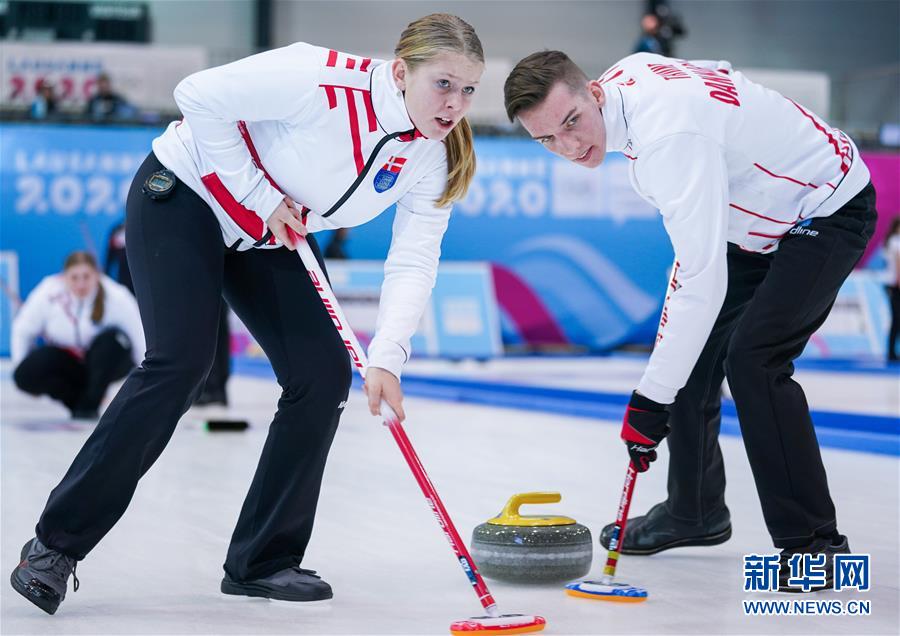 1月14日,丹麦队选手纳塔莉· 维克斯滕(左)和基利安·图内在比赛中。 当日,第三届冬季青年奥林匹克运动会冰壶混合团体赛B组循环赛在瑞士尚佩里冰壶馆举行,中国队以3比9不敌丹麦队,无缘四分之一决赛。 新华社记者白雪骐摄